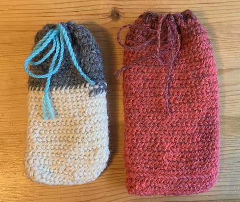 Våren 2025 var jag med på en liten nålbindnings cirkel. Att nålbinda är väl inte det roligaste jag gjort men ändå. Nyfiken är jag ju och det är intressant att känna till olika hantverk. Har tidigare nålat en liten påse till en USB adapter. För att veta var den är och vad den hör ihop med. Nu blev jag sugen på att nåla fler små pryl/förvaringspåsar. Lyckades plocka fram minnet hur man gör så det blev två stycken. Den vänstra är rester av garnet från dom vita vantarna och lite grått från något tidigare projekt. Den högra också något garn från restgarnslådan.