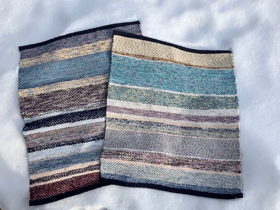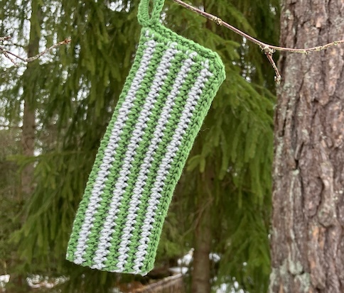 Våren 2025 var jag med på en liten nålbindnings cirkel. Att nålbinda är väl inte det roligaste jag gjort men ändå. Nyfiken är jag ju och det är intressant att känna till olika hantverk. Har tidigare nålat en liten påse till en USB adapter. För att veta var den är och vad den hör ihop med. Nu blev jag sugen på att nåla fler små pryl/förvaringspåsar. Lyckades plocka fram minnet hur man gör så det blev två stycken. Den vänstra är rester av garnet från dom vita vantarna och lite grått från något tidigare projekt. Den högra också något garn från restgarnslådan.